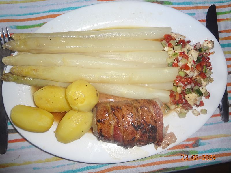 | | Schweinefilet im Bacon-Mantel, Spargel aus dem Ofen, Kümmel-Kart., Gemüse-Salat mit Mozzarella |