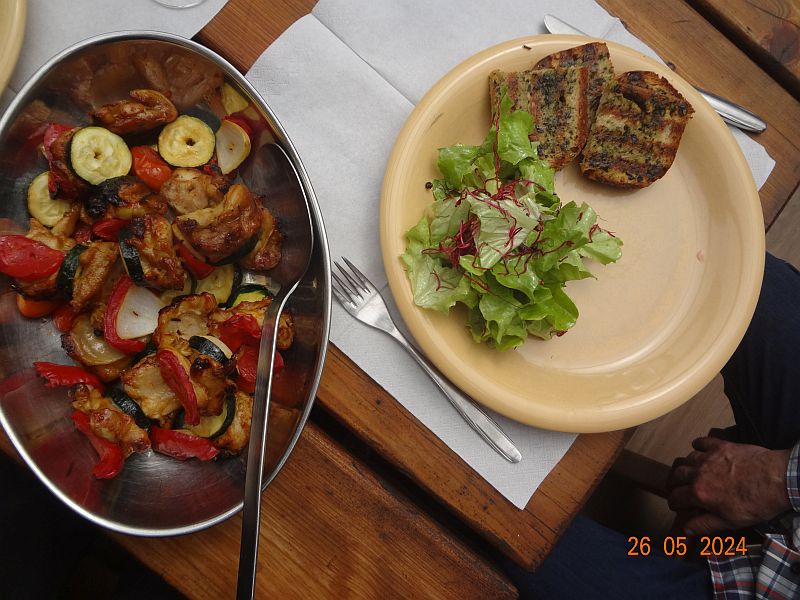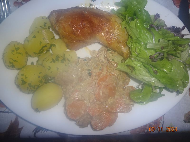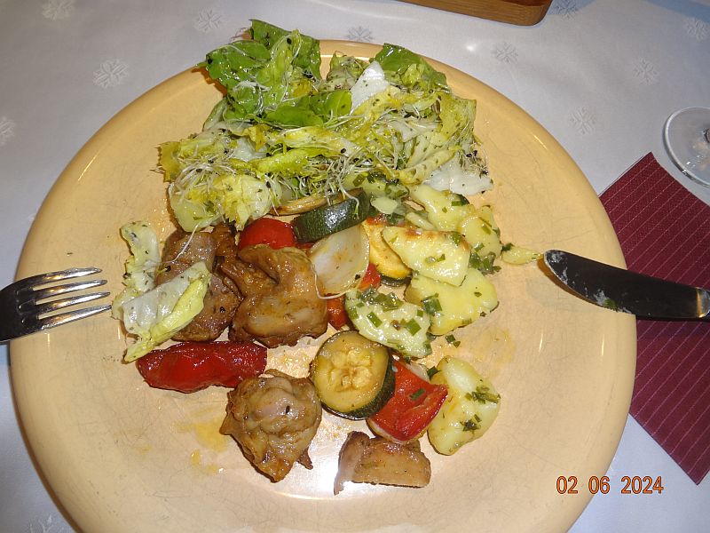 | | Fleisch vom Hähnchen-Spiess mit BUttergemüse in Sekt-Rahm-Soße, Pet.-Kart., Salatherzen mit Sprossen |