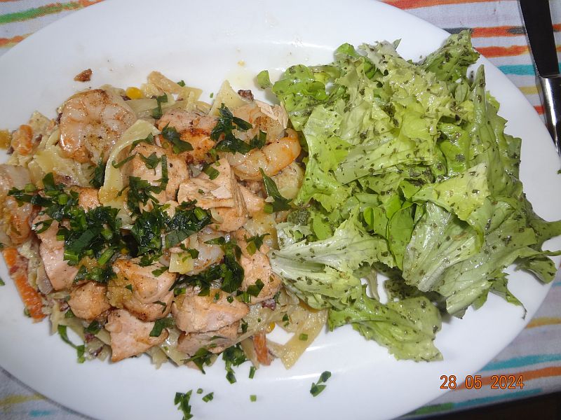 | | Lachs und Garnelen auf Tagliatelle mit Gemüse, Eichblatt-Salat mit Kräutern |