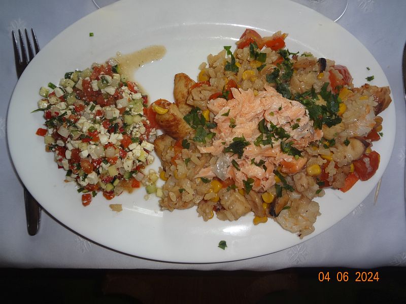 | | Paella mit Hähnchen-Fleisch, Meeresfrüchte, Eichblatt-Salat mit Kräutern, Ahornsirup, Zitronensaft, Leinöl |