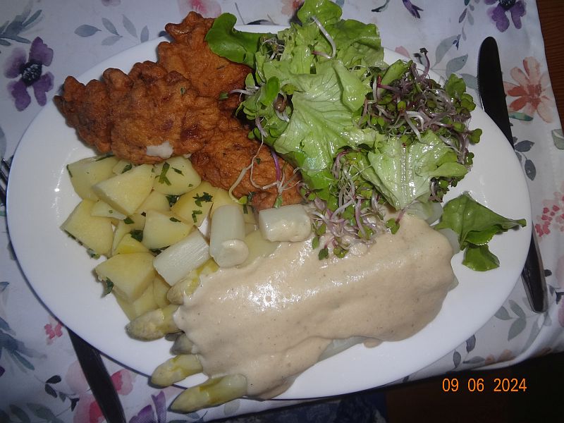 | | Hähnchen im Schlafrock, Spargel mit Sekt-Schmand-Soße, in Brühe gegarte Rosm.-Pet.-Kart., Eichblattsalat mit China-Rose-Sprossen |