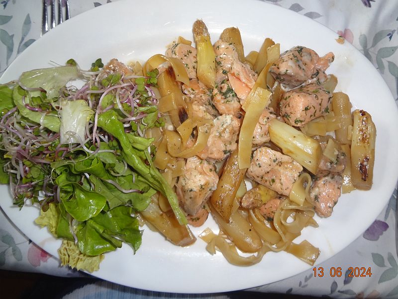 | | Lachs-Spargel-Pasta und Eichblatt-Endivien-Salat mit China-Rose-Sprossen |