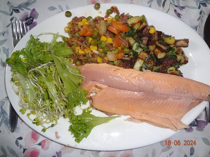 | | Selbstgeräucherte Forelle, gebratene Kartoffel-Würfel mit französischem Pfannengemüse, Lollo-Bionda-Salat mit Sprossen |