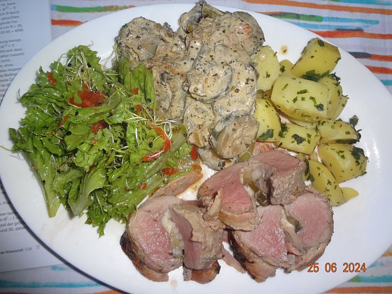| | Rinder-Hackfleisch-Rolle mit Steinpilzen, Pfifferlingen, Pet.-Kart., Tomaten-Salat |