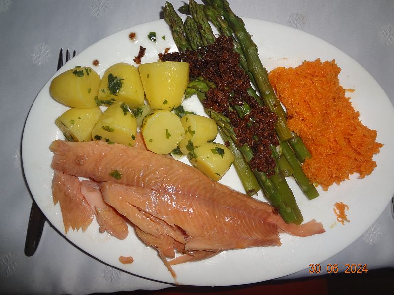 | | Selbstgeräucherte Lachsforellen-Filets, grüner Spargel, gebutterte Rosm.-Kart., Möhrensalat |