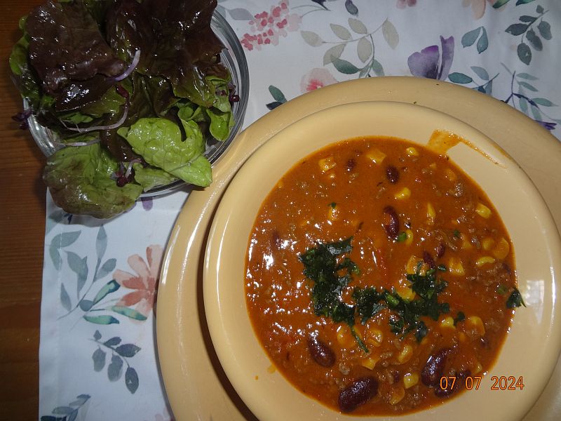 | | Spaghetti mit Bolognese aus selbstgeräucherten Hähnchenschenkeln, Mini-Römer-Salat |