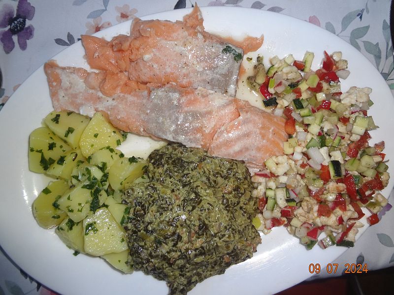 | | Vakuum gegartes Lachs-Filet, Spinat mit Sekt-Schmand-Soße, gebutterte Pet.Kart., Gemüse-Mozzarella-Salat |
