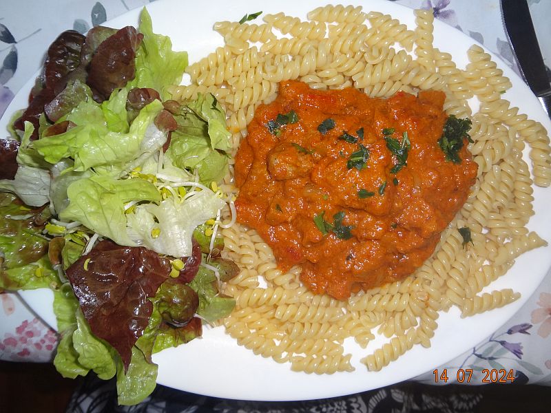 | | Tagliatelle mit Höhnchenfleisch, Tomaten-Ajvar-Schmand-Soße, Eichblatt-Salat mit Sprossen |