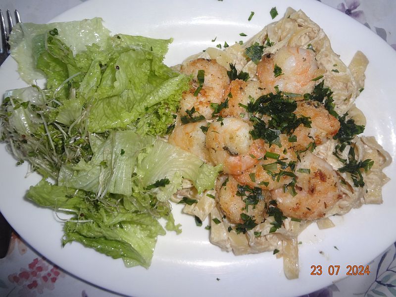 | | Tagliatelle mit Wein-Schmand-Soße und Garnelen, Lollo-Bionda-Salat mit Brokkoli-Sprossen |