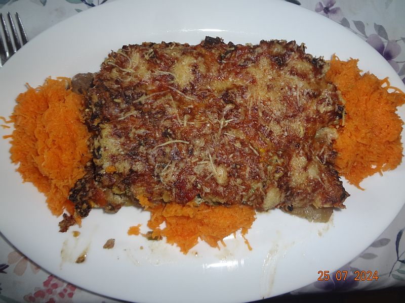 | | Schichtauflauf aus Kart.-Scheiben, mediterranem Gemüse, Nackenwürfeln und Grana Padano, Möhrensalat |