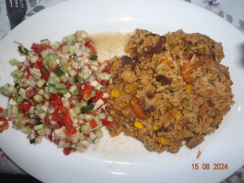 | | Basmatireis mit Rindfleisch und Mischgemüse, Gemüse-Mozzarella-Salat |