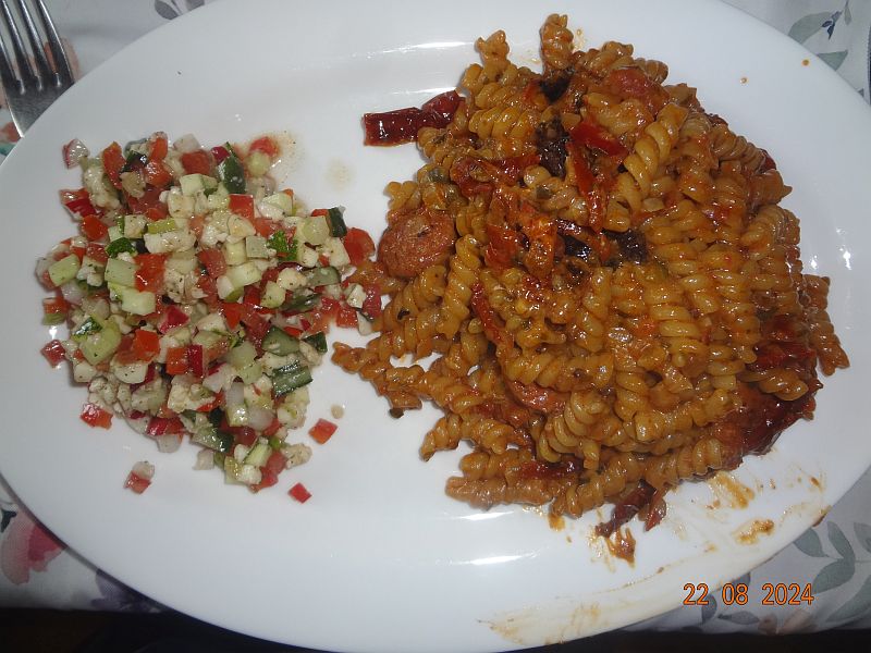 | | Pasta mit Salsiccia, getrockneten Tomaten, schwarzen Oliven und Kapern, Gemüsesalat mit Mozzarella |