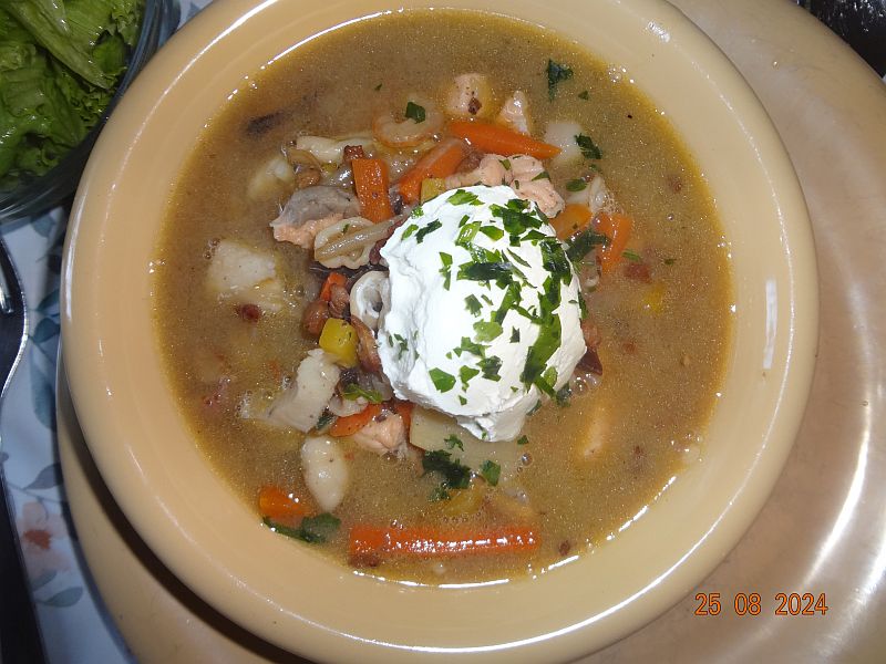 | | Fischsuppe mit Lachs, Garnelen, gemischtem Gemüse, Avocado und Schmand, Lollo-Bionda-Salat mit Radieschen-Sprossen |