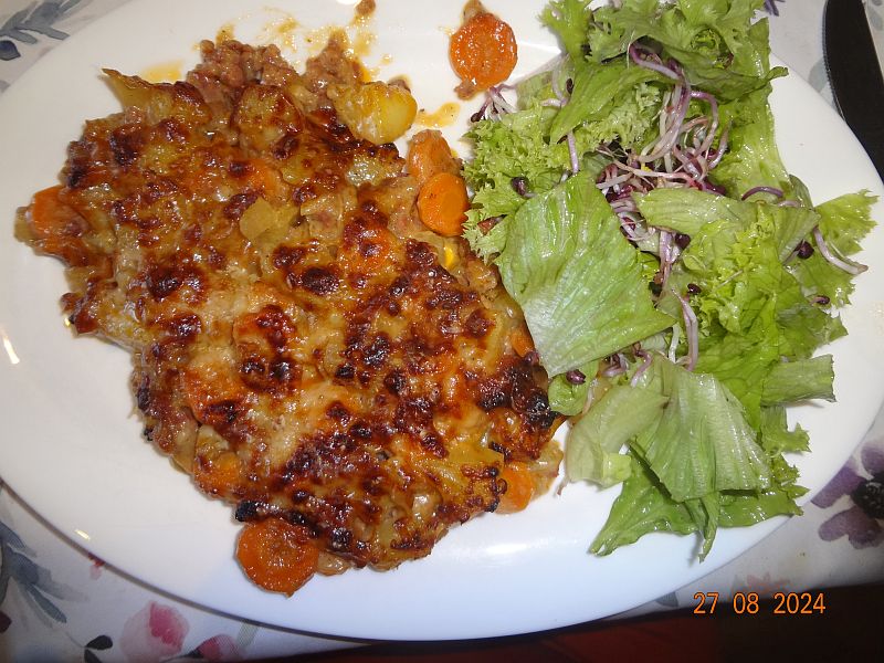 | | Schichtauflauf mit Kohlrabi-Scheiben, Zwiebeln, Hackfleisch, Champignons, Grieben aus Bacon, Tomatenscheiben, Käse-Bechamel-Soße, Möhrensalat mit Apfelstücken |