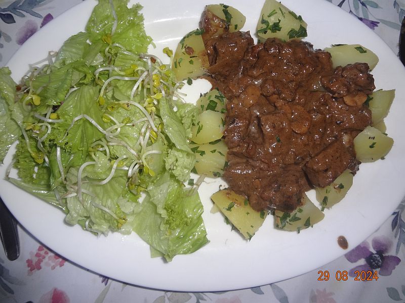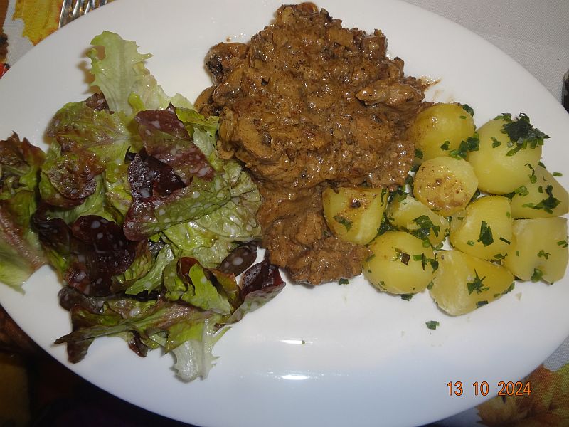 | | Schweinenacken-Gulasch mit Champignons in Steinpilz-Sekt-Schmand-Soße, Pet.-Kart., Eichblattsalat |