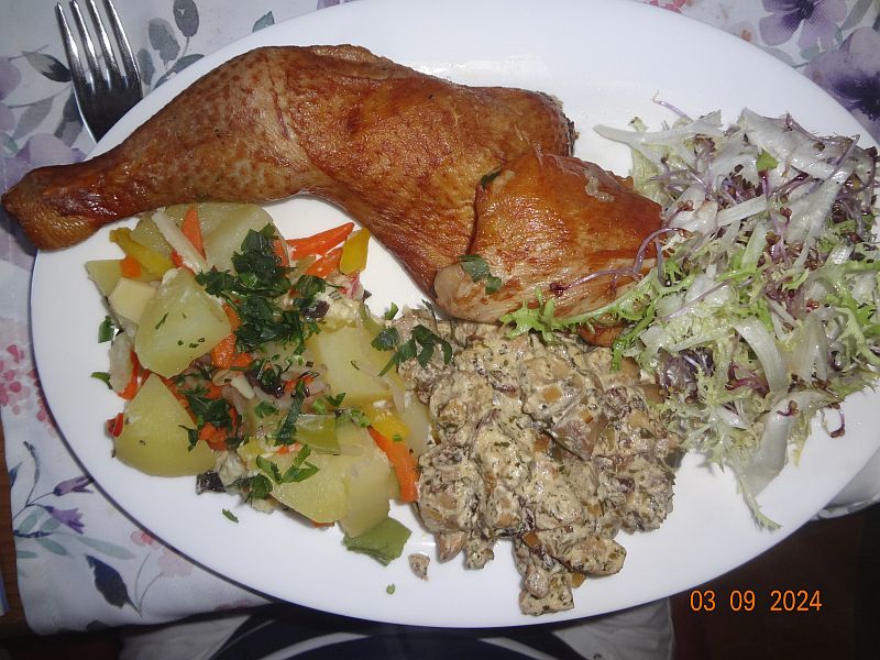 Selbstgeräucherte Hähnchenschenkel, Champignons in Sekt-Schmand-Soße, Mischgemüse-Kartfoffeln, Frisée-Salat mit Rotkohl-Sprossen |