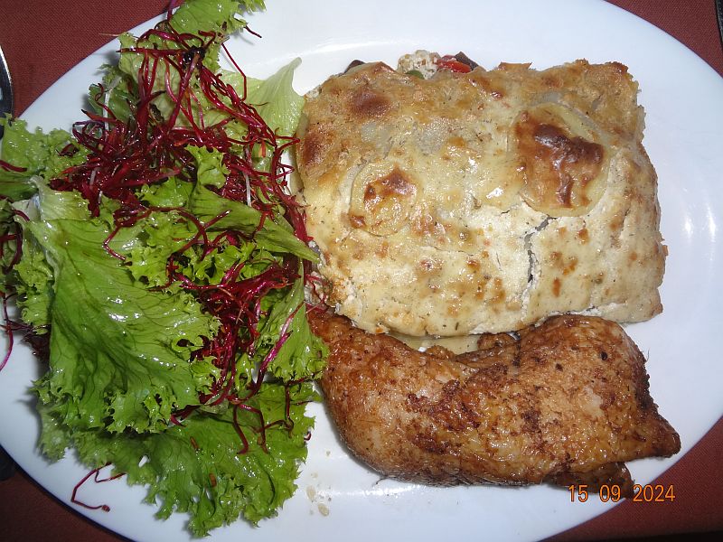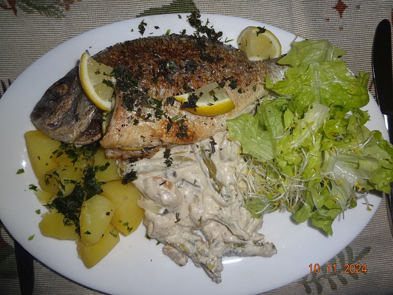 | | Gebratene gefüllte Dorade, Pilz-Spargel-Gemüse, Rosm.-Kart., Eichblatt-Salat mit Alfalfa-Sprossen |