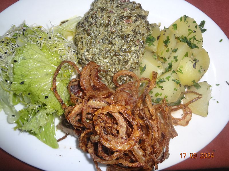 | | Nackensteak mit Kräuterbutter und fritierten Zwiebelringen, Spinat in Sekt-Schmand-Soße, Rosm.-Pet.-Kart., Lollo-Bionda-Salat mit Sprossen |