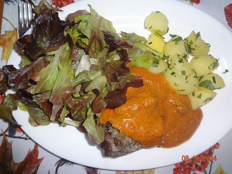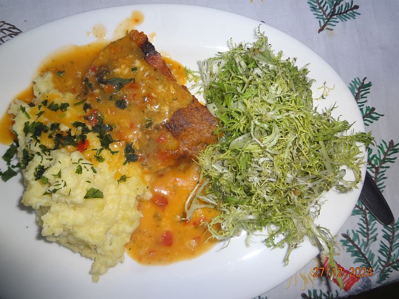 | | Schweinenacken-Schichtbraten, Sekt-Schmand-Tomatensoße, Pet.-Kart., Eichblattsalat |