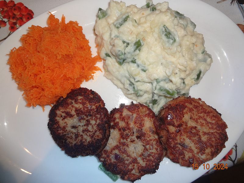 | | Frikadellen aus selbstgeräuchertem Wolfsbarsch, Kart.-Sellerie-Stampf mit grünen Bohnen, Möhrensalat |