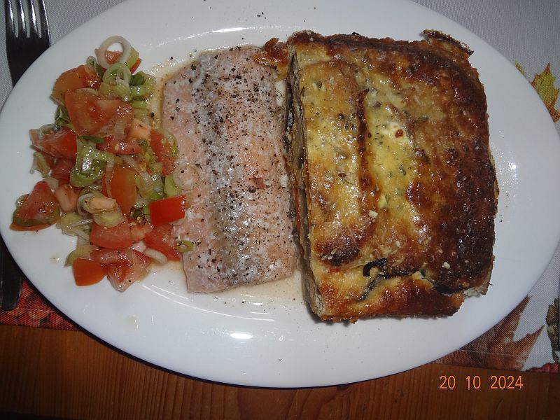 | | Auberginen-Paprika-Auflauf mit Käse, sous vide gegartes Lachsfilet, Tomatensalat |