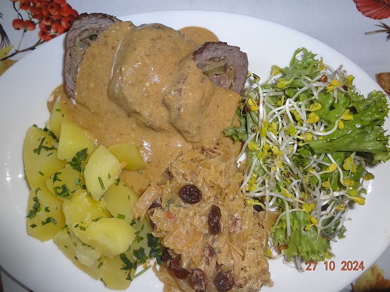 | | Schweine-Rouladen, Sellerie-Soße, Pet.-Kart., Salatherzen mit Sprossen |