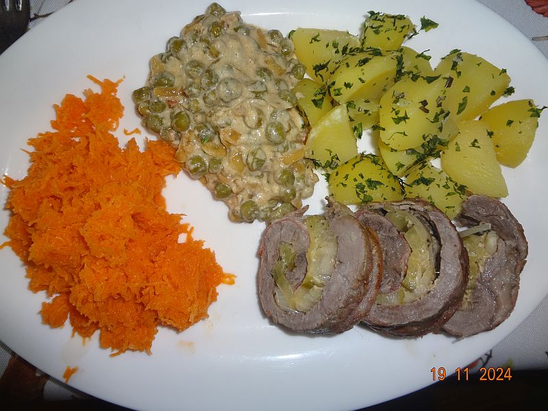 | | Schweinenacken-Rollbraten, grüne Erbsen, Pet.-Kart., Möhrensalat |