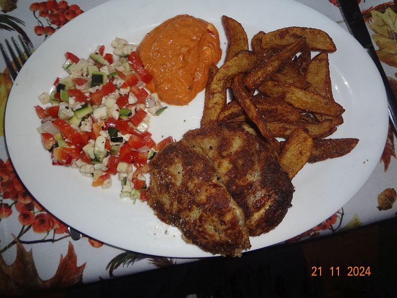 | | Filet-Schnitzel, pommes frites, Ajvar-Schmand-Tomaten-Dip, Gemüsesalat mit Mozzarella |