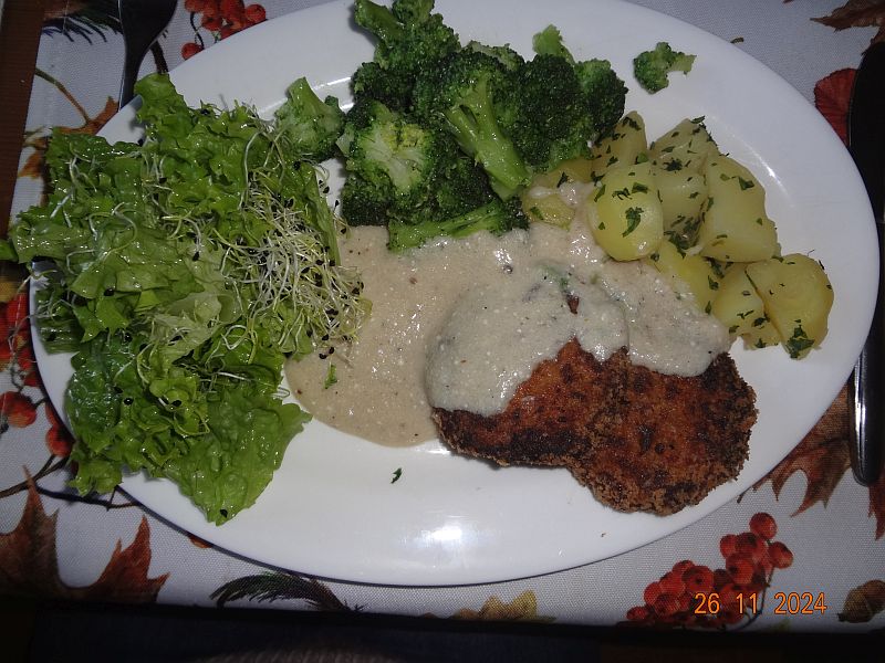 | | Bratklops, Brokkoli, Pet.-Kart., Hähnchen-Brühsoße, Lollo-Bionda-Salat mit Sprossen |