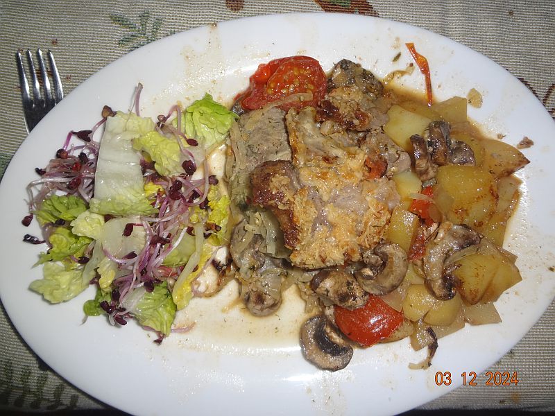 | | Entrecôte, Pfifferlinge, Mischgemüse, geröstete Kartoffel-Würfel, Eichblatt-Salat mit diversen Sprossen |