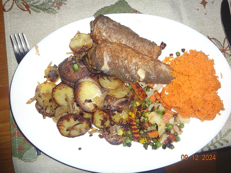 | | Bratheringe, Gemüse-Bratkartoffeln, Möhrensalat |