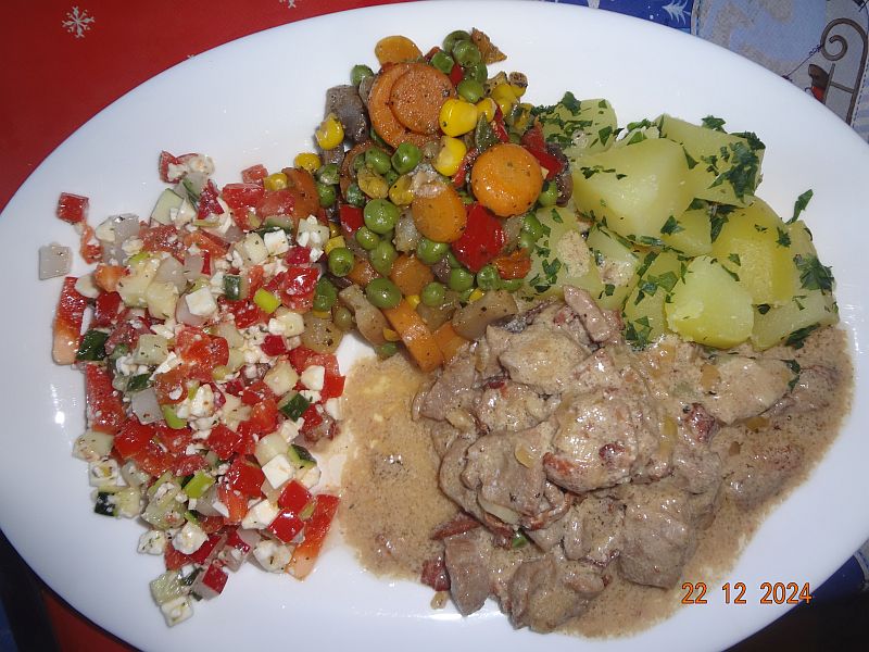 | | Schweine-Geschnetzeltes in Sekt-Schmand-Soße, Pfannengemüse, Pet.-Kart., Gemüsesalat mit Feta |