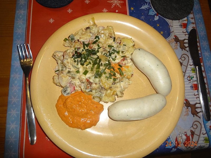 | | Kartoffelsalat mit Mayo, Paprika, Zucchini, Zwiebeln, Radieschen, Gewürzgurke und Weißwurst, Dip |