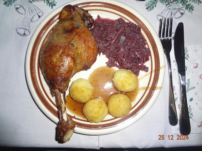 | | Sous vide gegarte Entenkeule, Apfelrotkohl, Mini-Kartoffelknödel, Frisée-Salat, Möhrensalat |