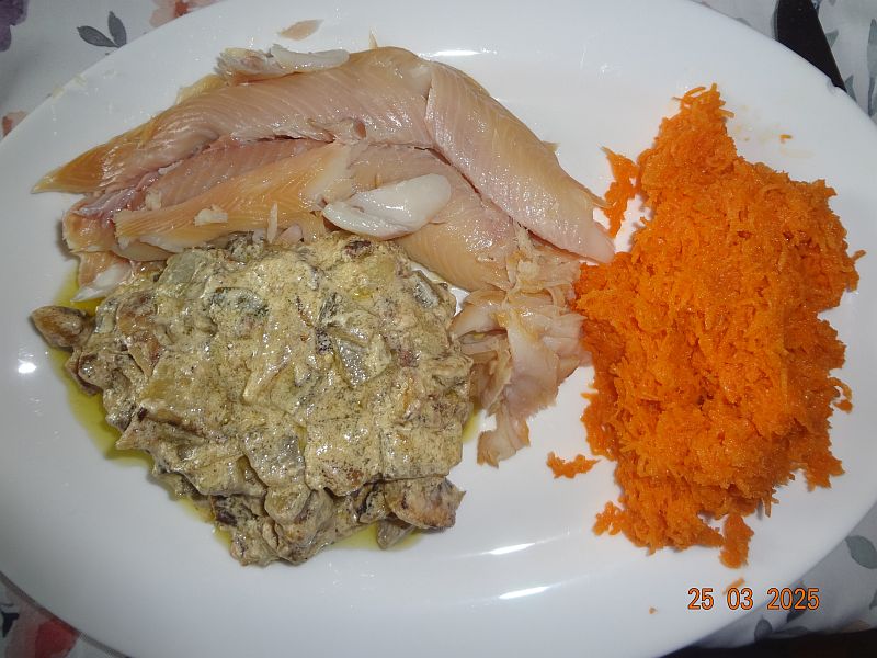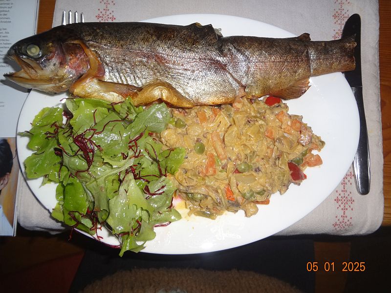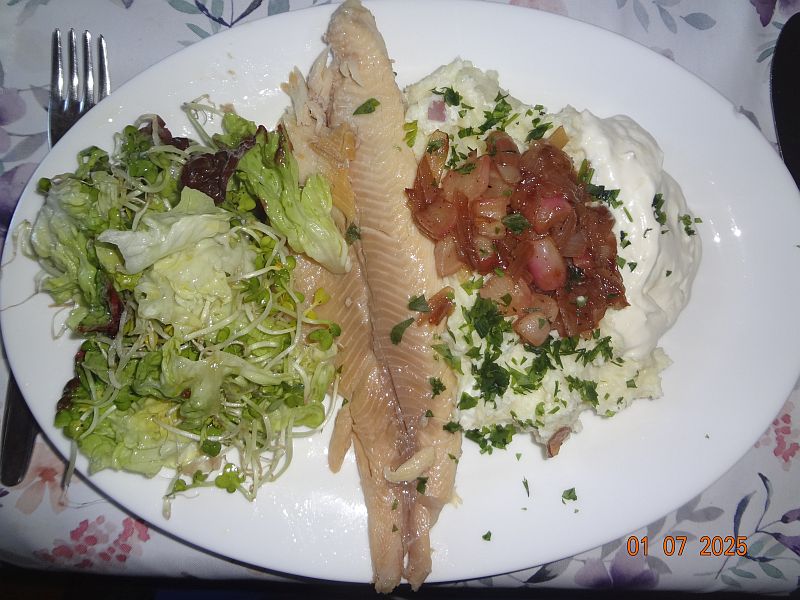 |  | | Selbstgeräucherte Forelle, Kart.-Mayonnaise-Salat, Möhrensalat |