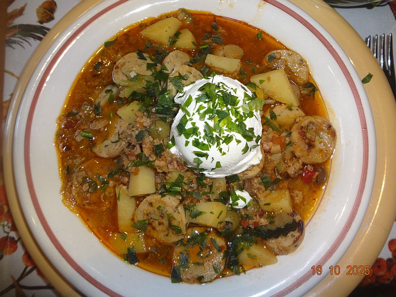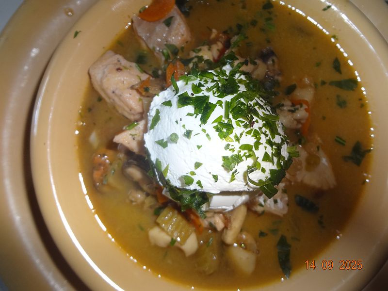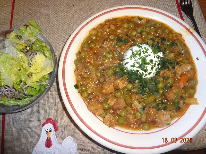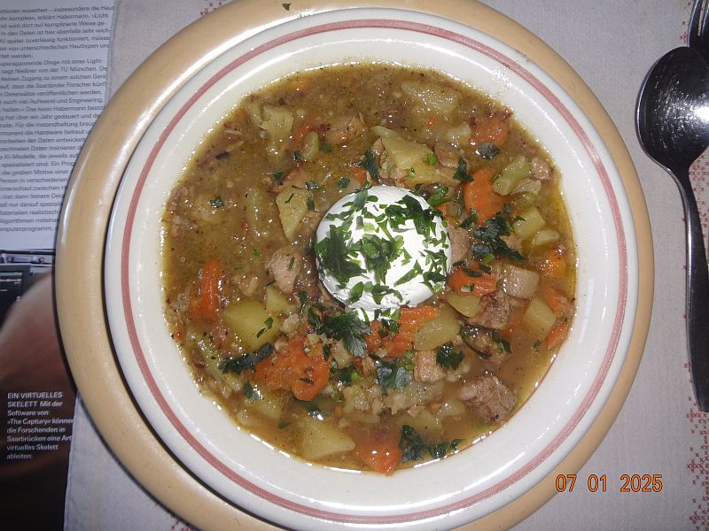 | | Fleisch-Gemüse-Eintopf, Schmand, Petersilie |