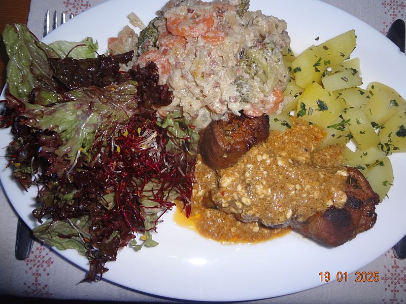 | | Rouladen vom Schweinenacken, gemischtes Gemüse(Brokkoli, Blumenkohl, Möhren), Sekt-Schmand-Soße, Rosmarin-Kart., Lollo-Bionda-Salat mit Rote-Bete-Sprossen |