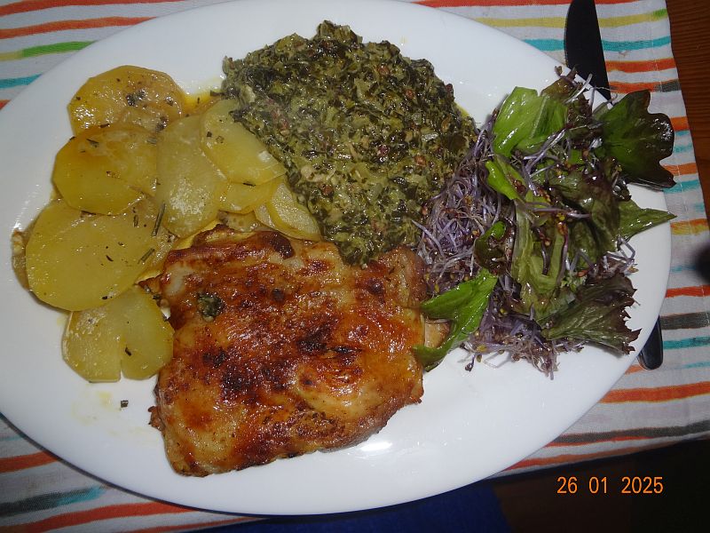 | | Filetierte, gebratene Hähnchen-Schenkel, Kart.-Scheiben aus dem Ofen, Spinat, Eichblattsalat mit Rotkohlsprossen |