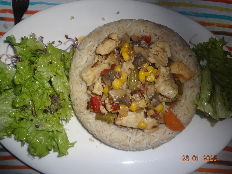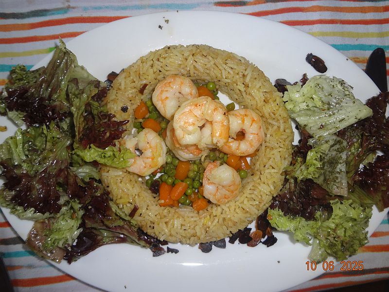 | | Reis-Gemüse-Pfanne mit Garnelen, Lollo-Rosso-Salat mit Salatkräutern |