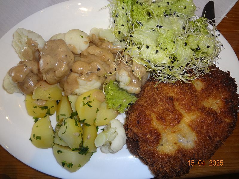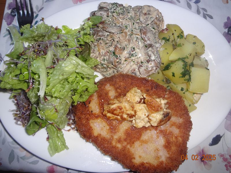 | | Paniertes Kasseler-Nackensteak, Champignons in Sekt-Schmand-Soße, Pet.-Kart., Salat mit Rotkohl-Sprossen |
