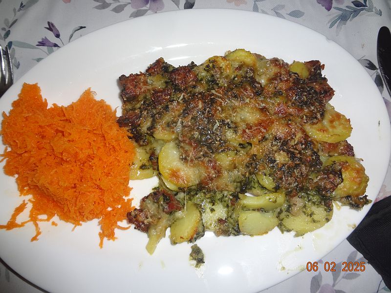| | Käse-überbackener Kart.-Auflauf mit Lamm-Hackfleisch, Möhrensalat |