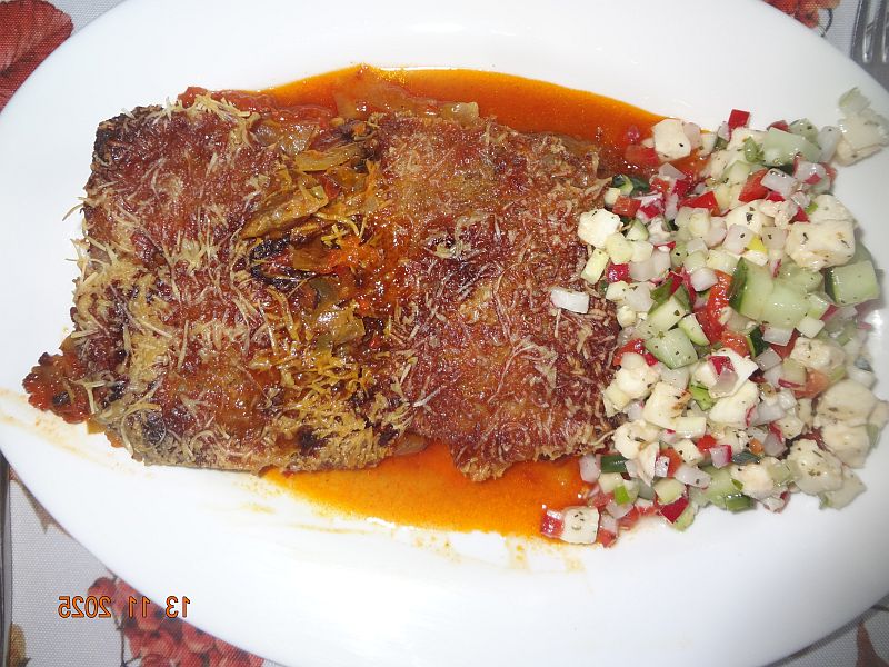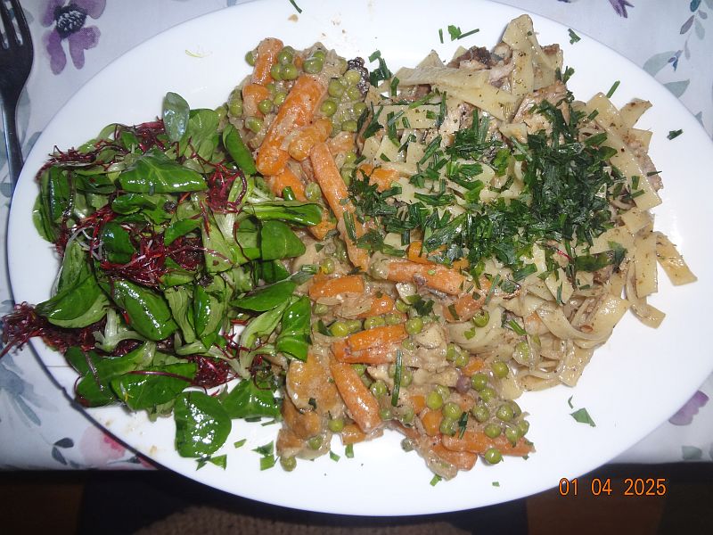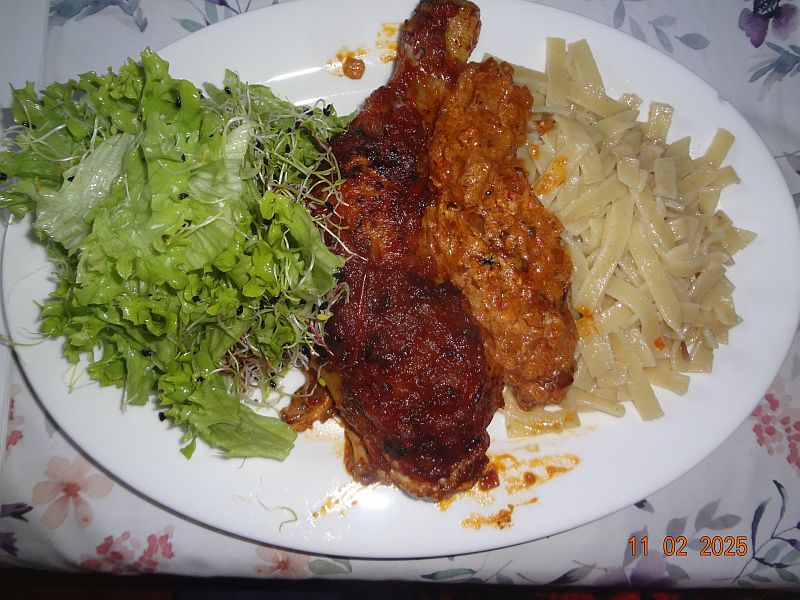 | | Gebratene Hähnchenschenkel, Soße aus Tomaten, Ajvar (mild und pikant), Schmand und Käse, Tagliatelle, Frisée-Salat mit Sprossen |