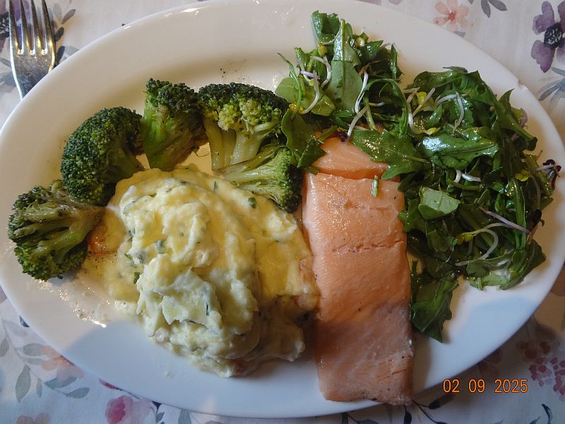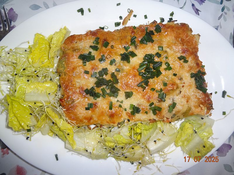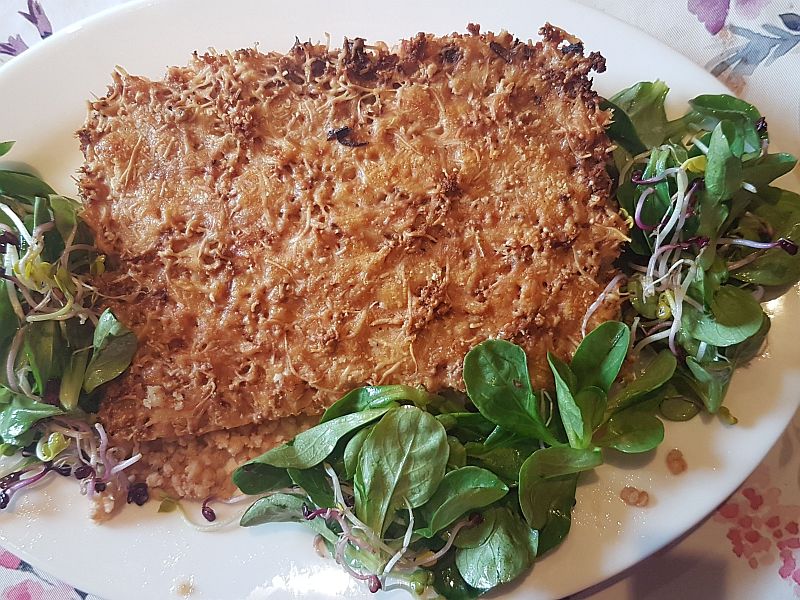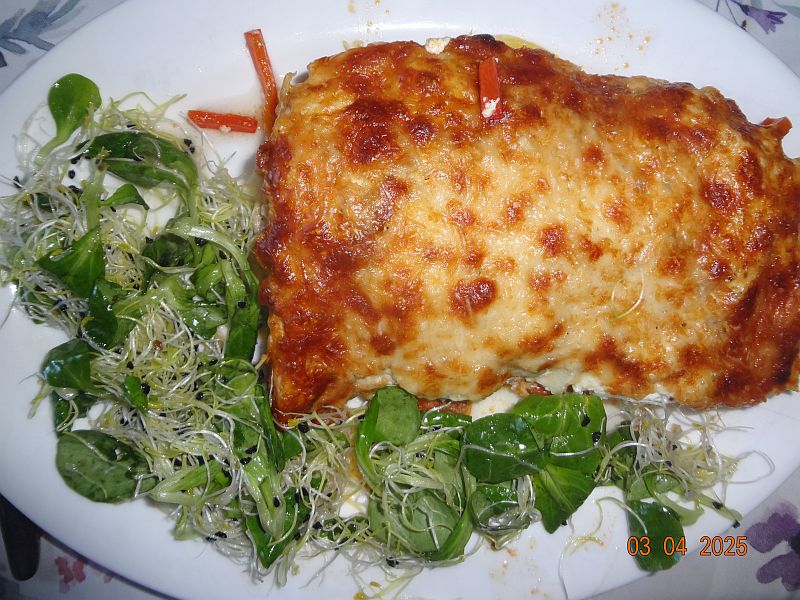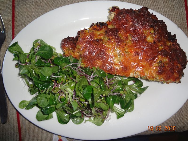 | | Schichtauflauf mit Kart., selbstgeräuchertem Lachs, Champignons und geriebenem Käse, Feldsalat mit Sprossen |