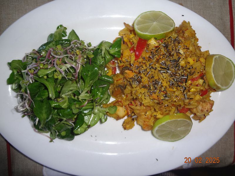 | | Paella, Feldsalat mit China-Rose-Sprossen |