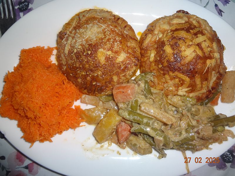 | | Hackbraten, Mischgemüse in Käse-Soße, Pet.-Kart., Rukola-Salat mit Sprossen |