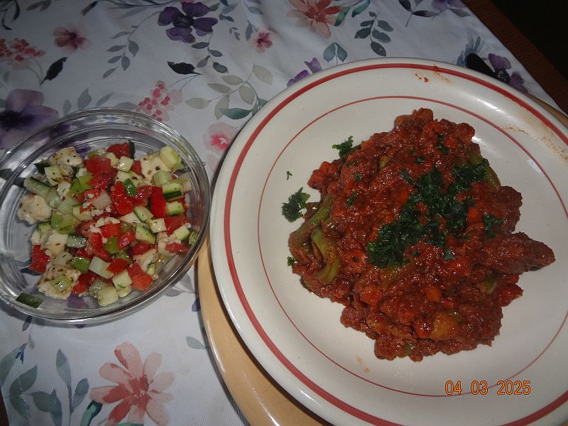 | | Lamm-Gulasch mit Kart., Sellerie, Möhren und grünen Bohnen, Gemüse-Salat mit Mozzarella |