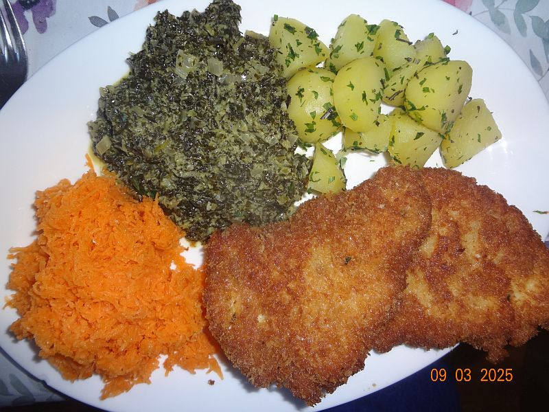 | | Gebratene Hähnchenbrust-Filets, Schmand-Spinat, Pet.-Kart., Möhrensalat |