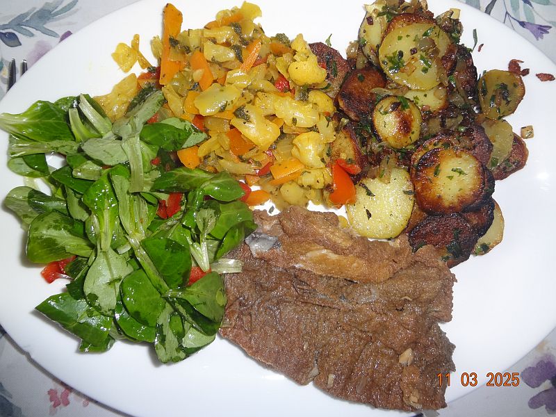 | | Rindersteak, Mischgemüse, Kart.-Sellerie-Stampf, Gemüse-Salat mit Feta und Leinöl |