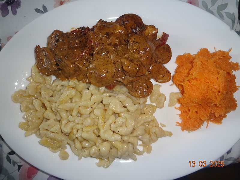 | | Weißwurst-Gulasch, mit Steinpilzen, Käse-Spätzle, Möhrensalat |