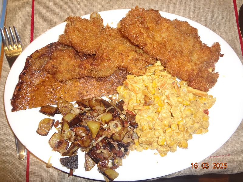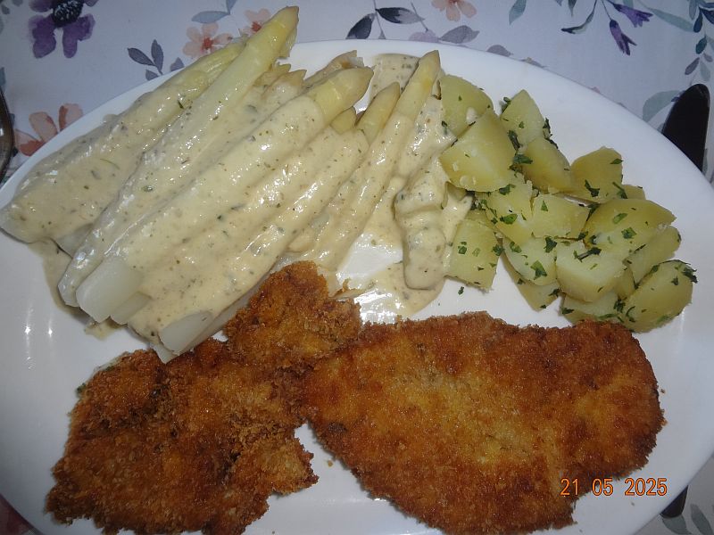 | | Panierte Hähnchenbrust-Filets, Spargel mit selbstgemachter holländischer Soße, Pet.-Kart., Feldsalat mit Rotkohl-Sprossen |